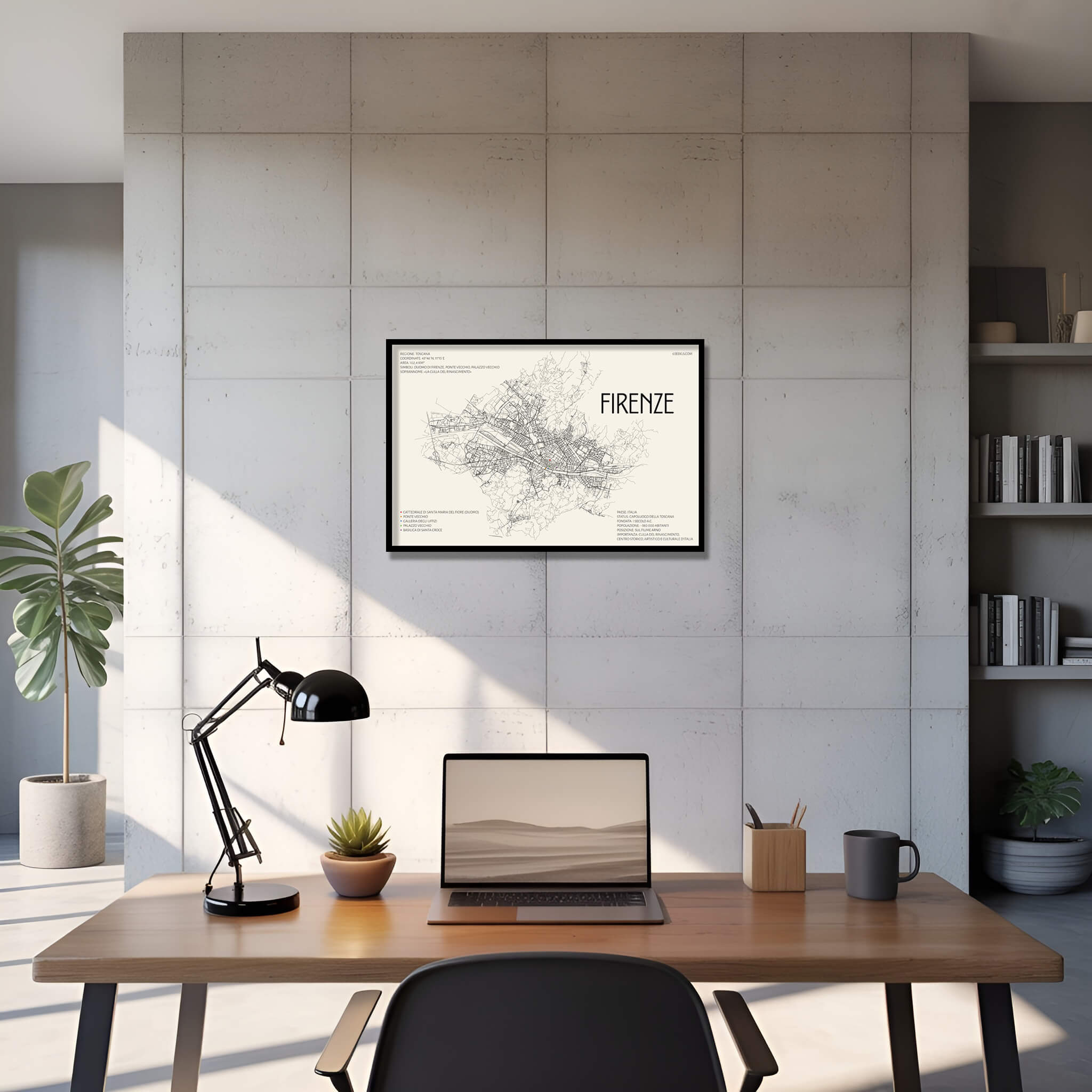 A framed horizontal map print of Florence rendered in fine-line detail on matte museum-grade paper. The soft cream background and precise black ink lines create an elegant, vintage-modern look that settles into a living room, study, or hallway without shouting. The slim wooden frame (available in black) and plexiglass front keep the piece crisp and protected, while archival pigment inks preserve the contrast and subtlety for years. Pre-installed hanging hardware makes it easy to mount straight away. This piece reads like a quiet travel memory – familiar streets, small landmarks called out with minimalist labels – and brings a calm, curated presence to everyday spaces.