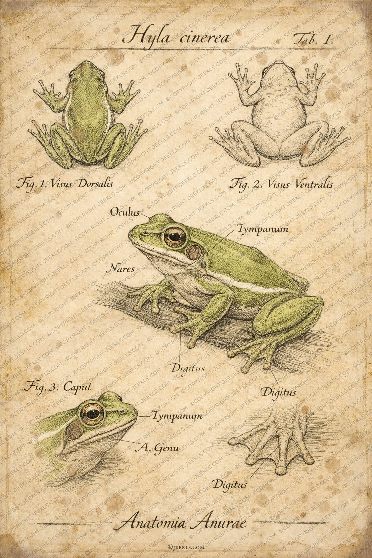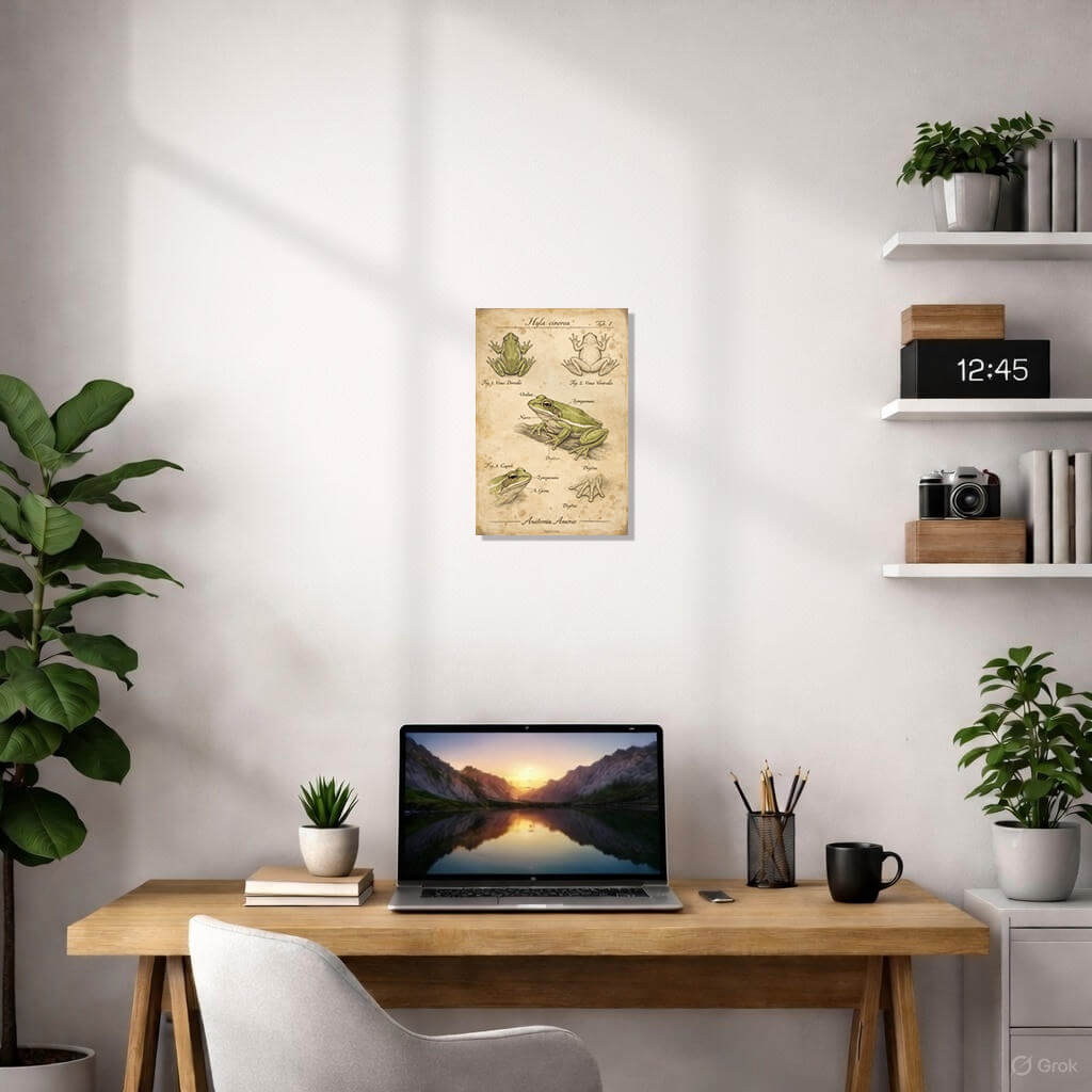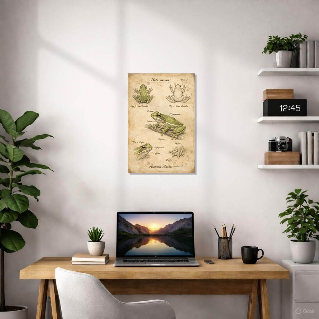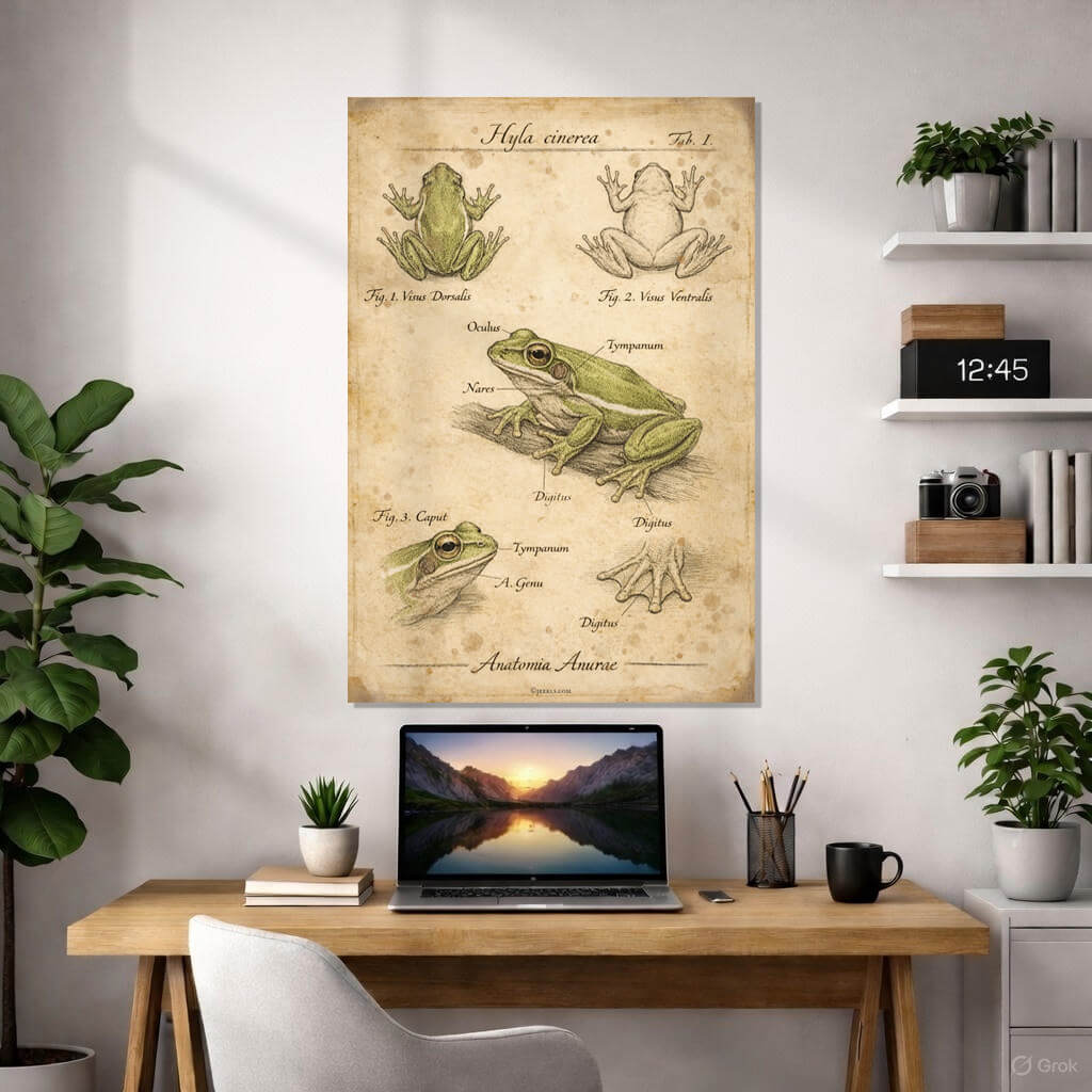 Immerse yourself in the elegance of natural history with this exquisite anatomical study of the American Green Tree Frog (Hyla cinerea). Part of the exclusive Jeekls vintage collection, this poster captures the delicate balance between scientific precision and antique artistry.