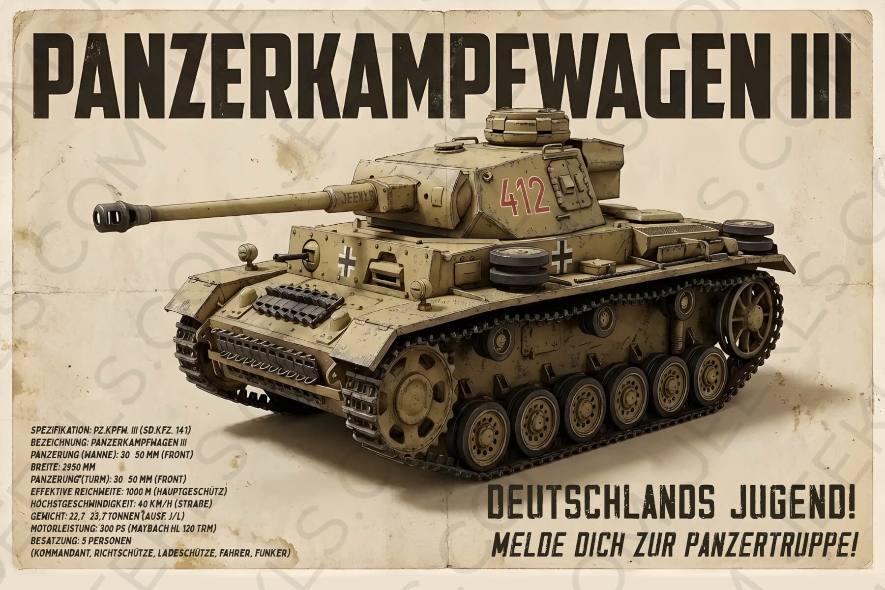 The design is enhanced with authentic technical specifications in German, detailing its 1000m effective range, 300 PS Maybach engine, and 5-man crew configuration. At the bottom, a bold historical recruitment call—“Deutschlands Jugend! Melde dich zur Panzertruppe!”—adds a layer of cultural and historical depth, making it look like a genuine artifact from the 1940s.