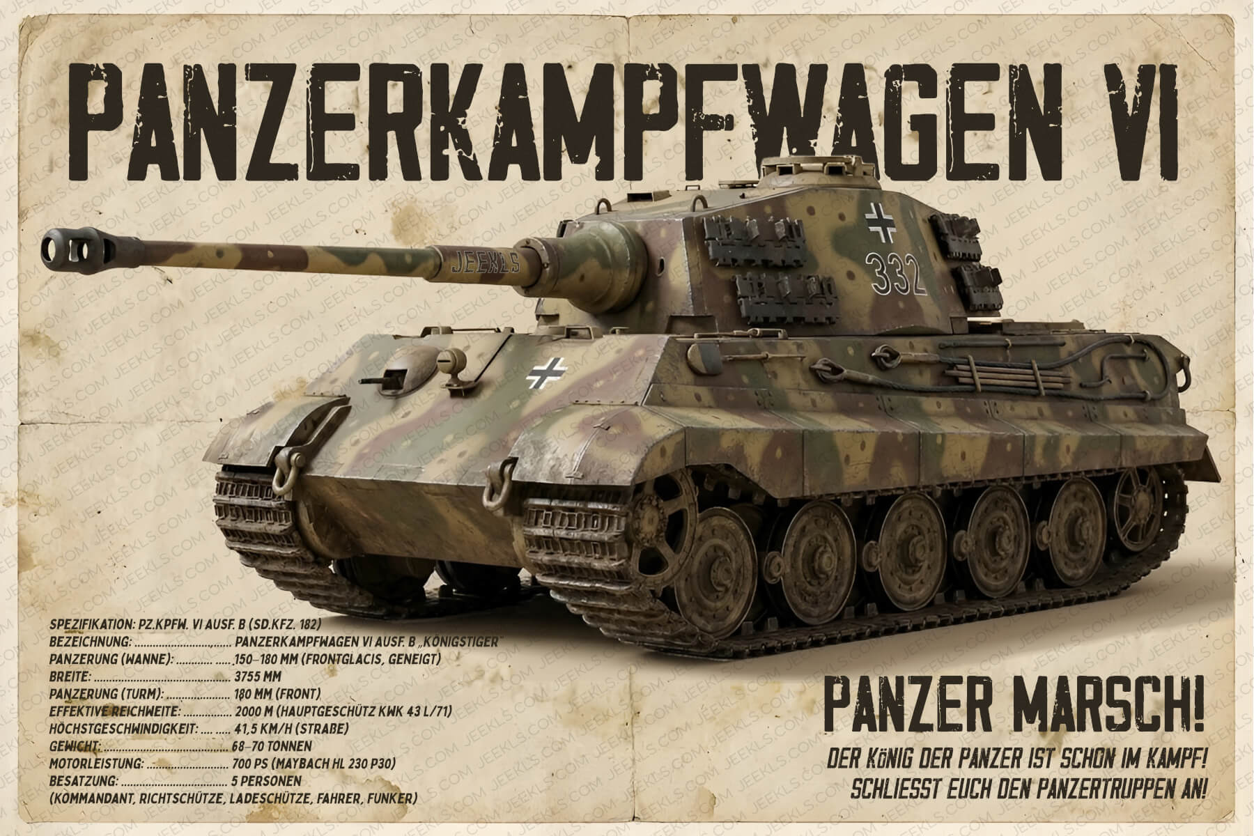 Step into WWII legend with this “Panzer VI Königstiger Vintage Propaganda Poster – German WWII Tank Art .” Inspired by 1940s German technical schematics, it showcases the mighty Panzer VI Ausf. B “King Tiger” (Pz.Kpfw. VI Tiger II) in intricate detail, with authentic specifications in German and distressed parchment texture.
