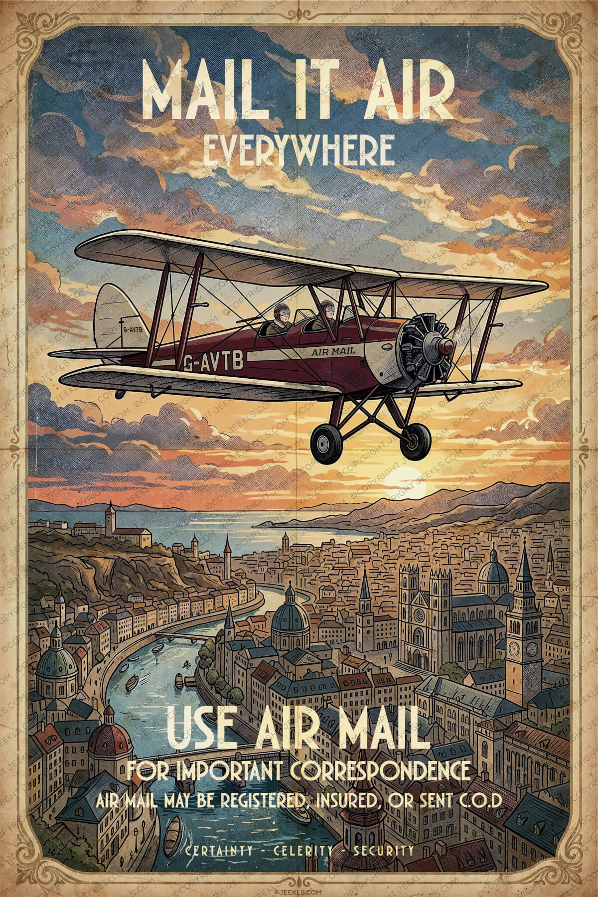 Step back into the golden age of aviation with this stunning vintage-style air mail poster featuring a classic red biplane soaring over a historic European city at sunset. The bold slogan “MAIL IT AIR EVERYWHERE” evokes the romance and speed of early 20th-century airmail service — “Certainty – Celerity – Security.”