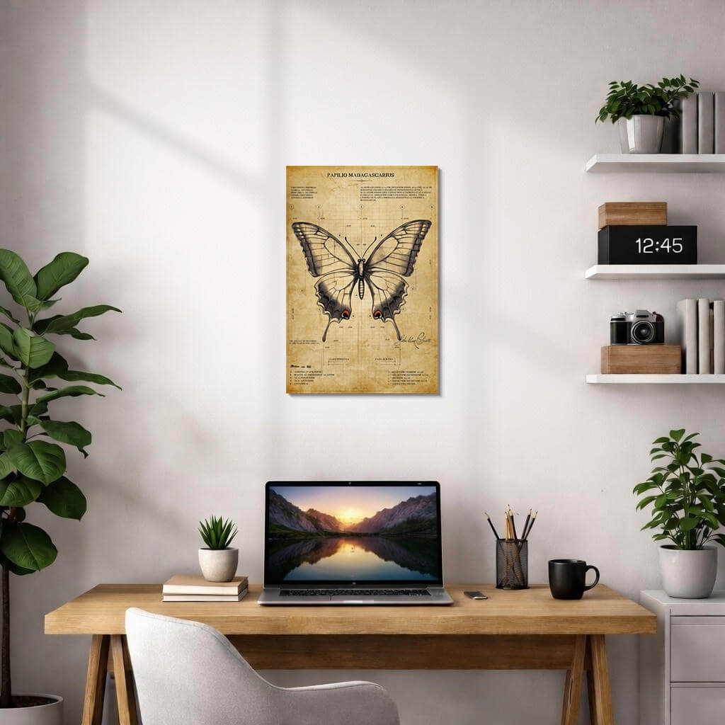This poster brings a quiet, vintage calm to any wall. Rendered in soft sepia tones, the hand-drawn butterfly floats on aged paper with delicate shading and subtle red accents at the wing tips. Choose satin for a gentle sheen that makes the pencil strokes sing, or archival matte for a museum-like, non-reflective finish that emphasizes texture. It hangs easily in living rooms, reading nooks, or a studio where slow mornings and thoughtful details matter. The artwork feels like a discovered page from a naturalist’s sketchbook — personal, curious, and quietly elegant — and it pairs naturally with woven throws, potted greens, and well-loved books.