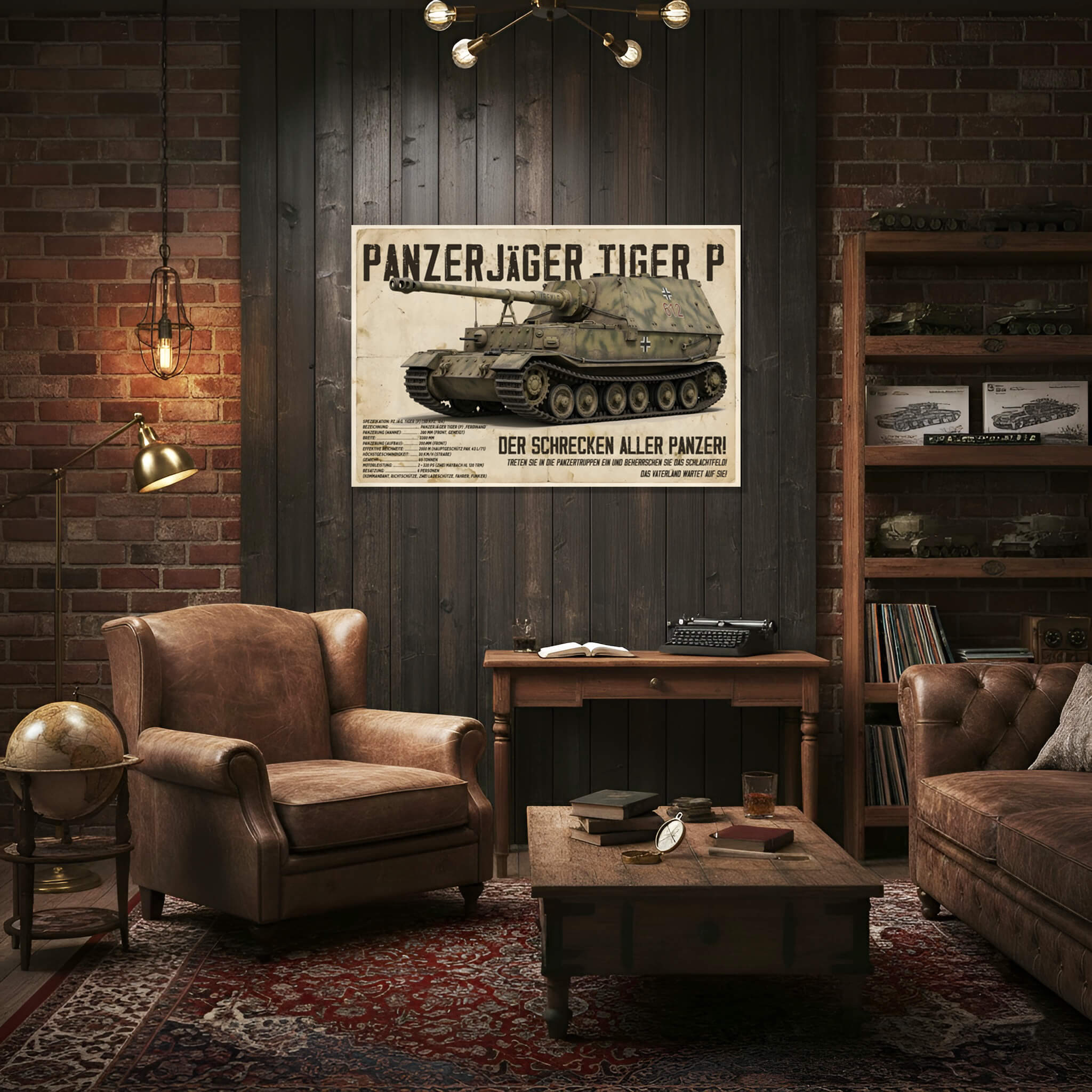 Relive WWII legend with this “Vintage Ferdinand Heavy Tank Destroyer Propaganda Poster – German WWII Panzerjäger Poster.” Inspired by 1940s German technical drawings, it features the massive Panzerjäger Tiger (P) “Ferdinand” heavy tank destroyer in detailed desert camouflage, complete with authentic specifications in German and aged parchment texture