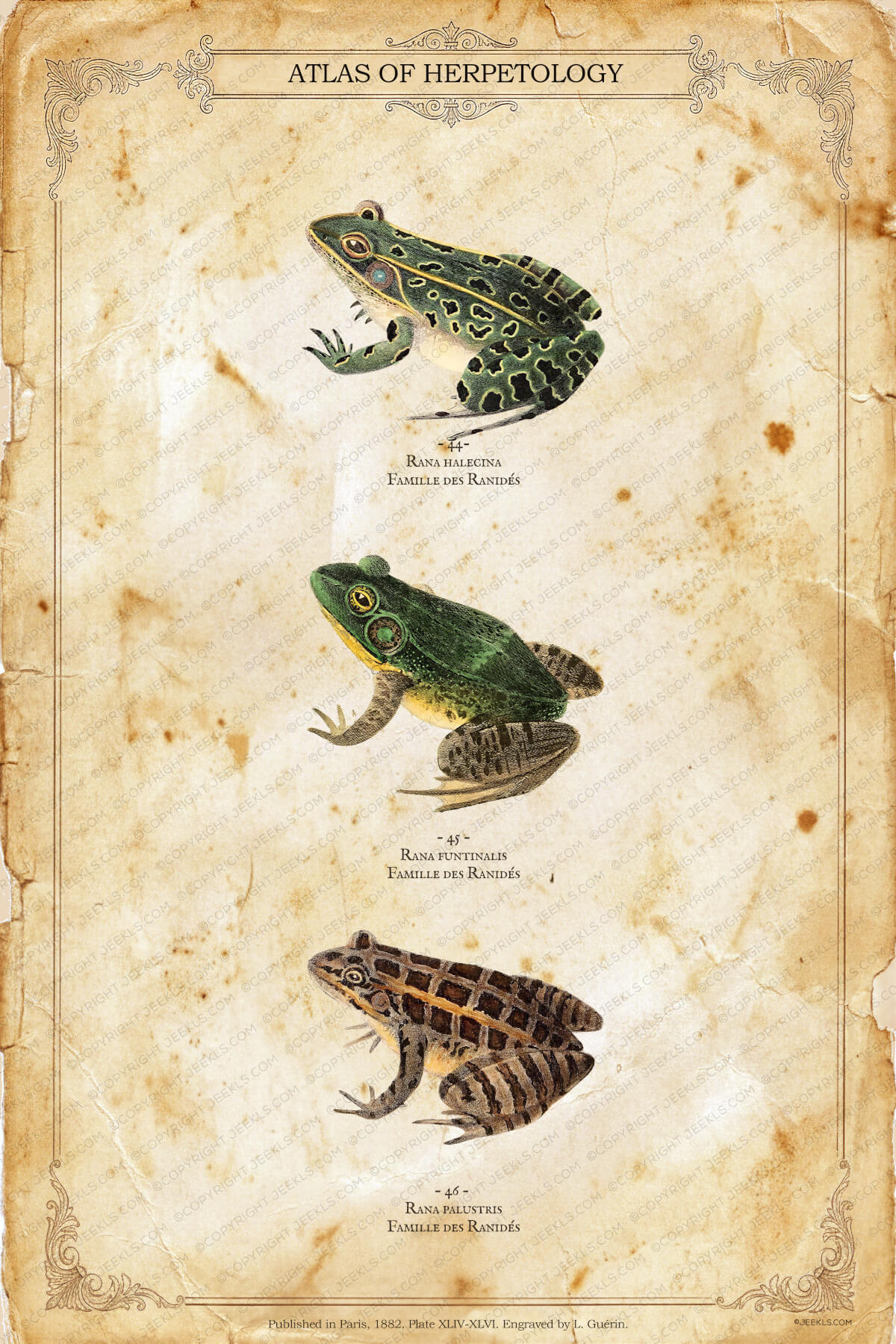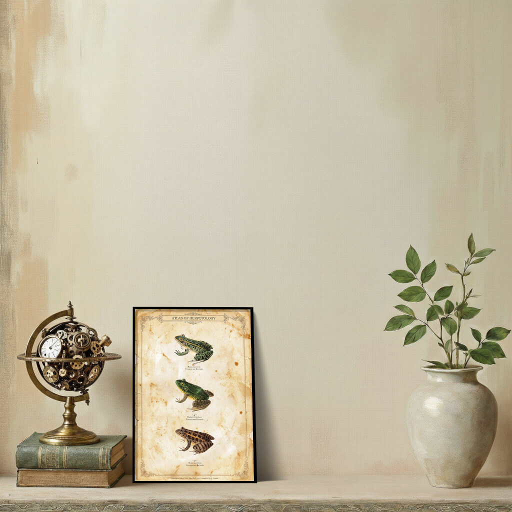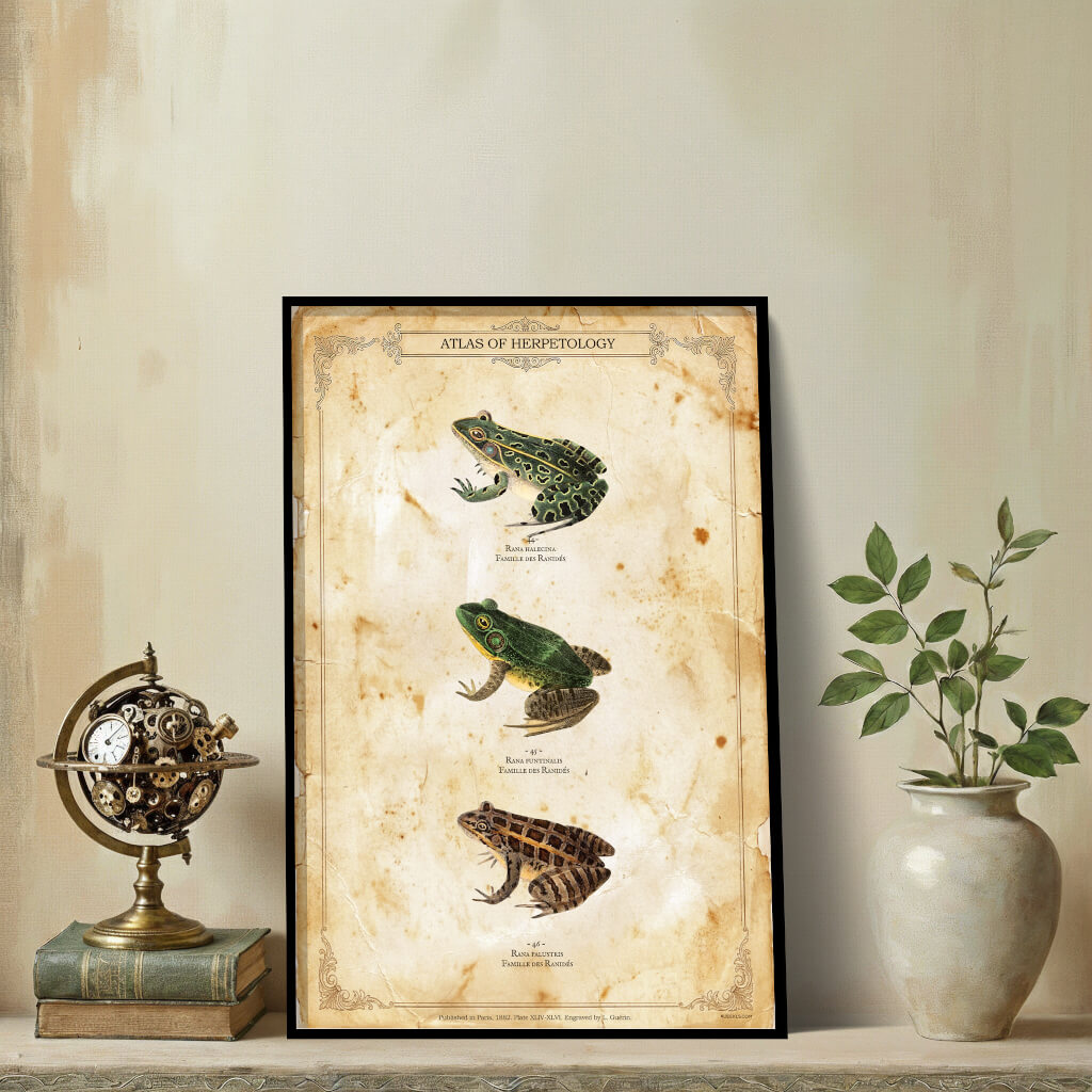 Celebrate the intricate beauty of the marshlands with this exquisite vintage-style scientific plate from our “Atlas of Herpetology” collection. This poster features three beautifully detailed specimens of the Ranidae family, recreated with the precision and elegance of 19th-century zoological illustrations.