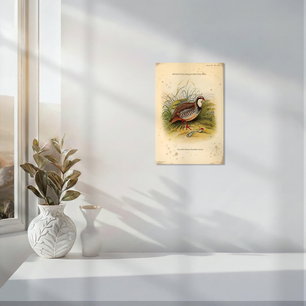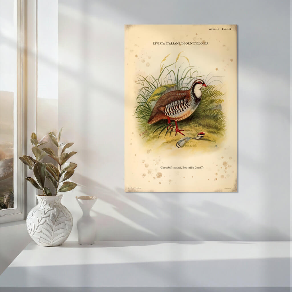 Bring the charm of the Italian countryside into your home with this exquisite vintage bird illustration of Caccabis labatei (a rare subspecies of the Rock Partridge). This stunning print is a meticulous restoration from the prestigious 19th-century publication “Rivista Italiana di Ornitologia”.